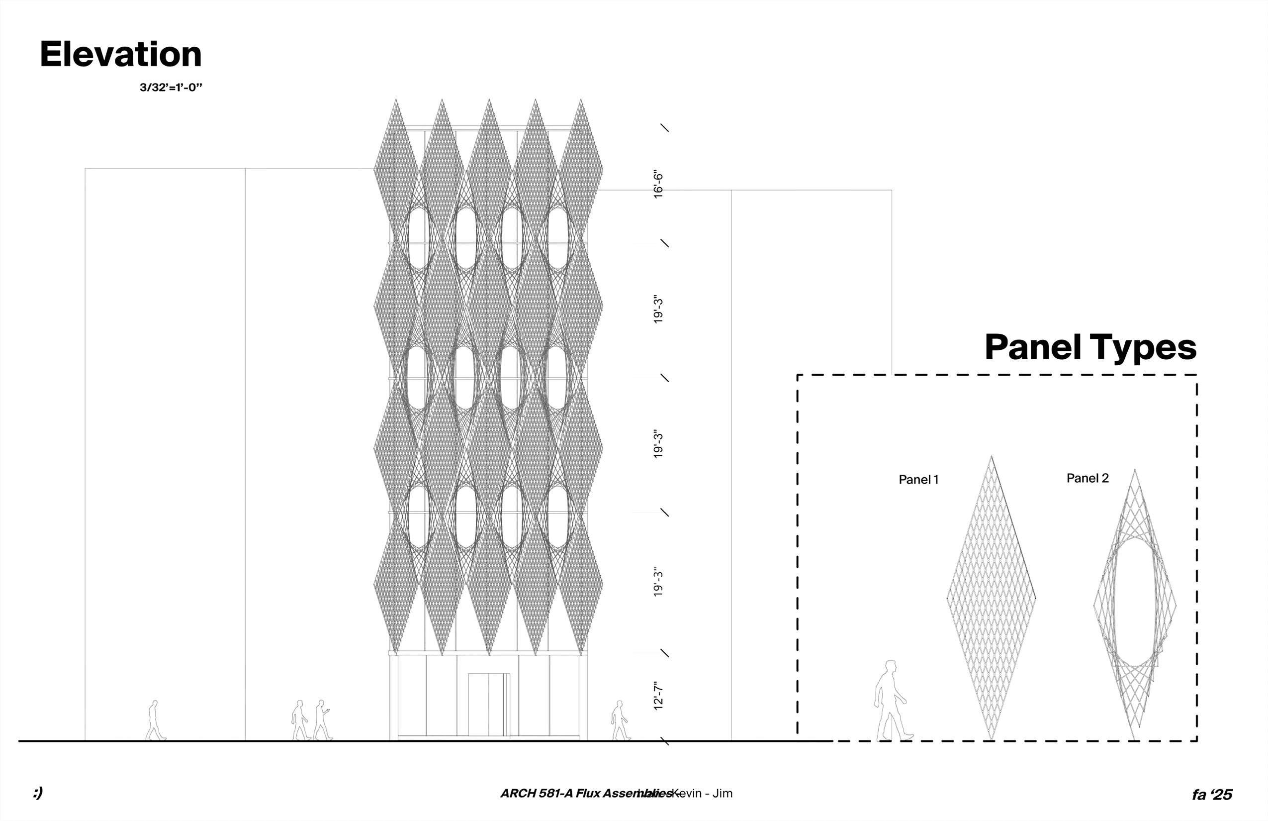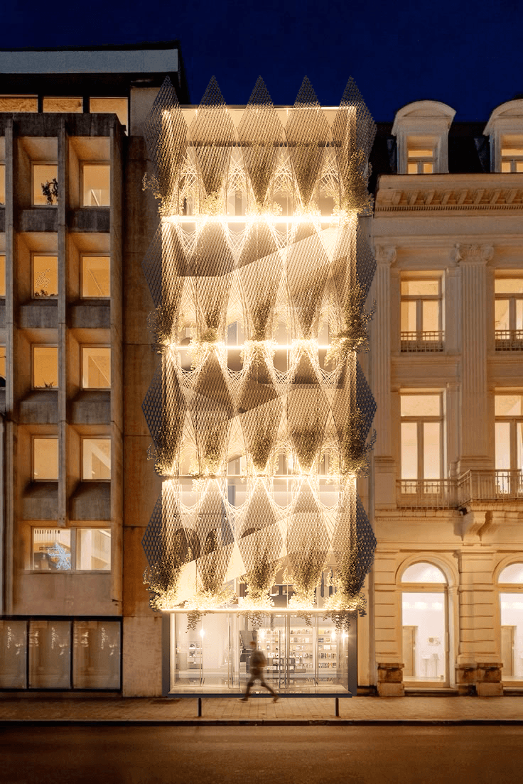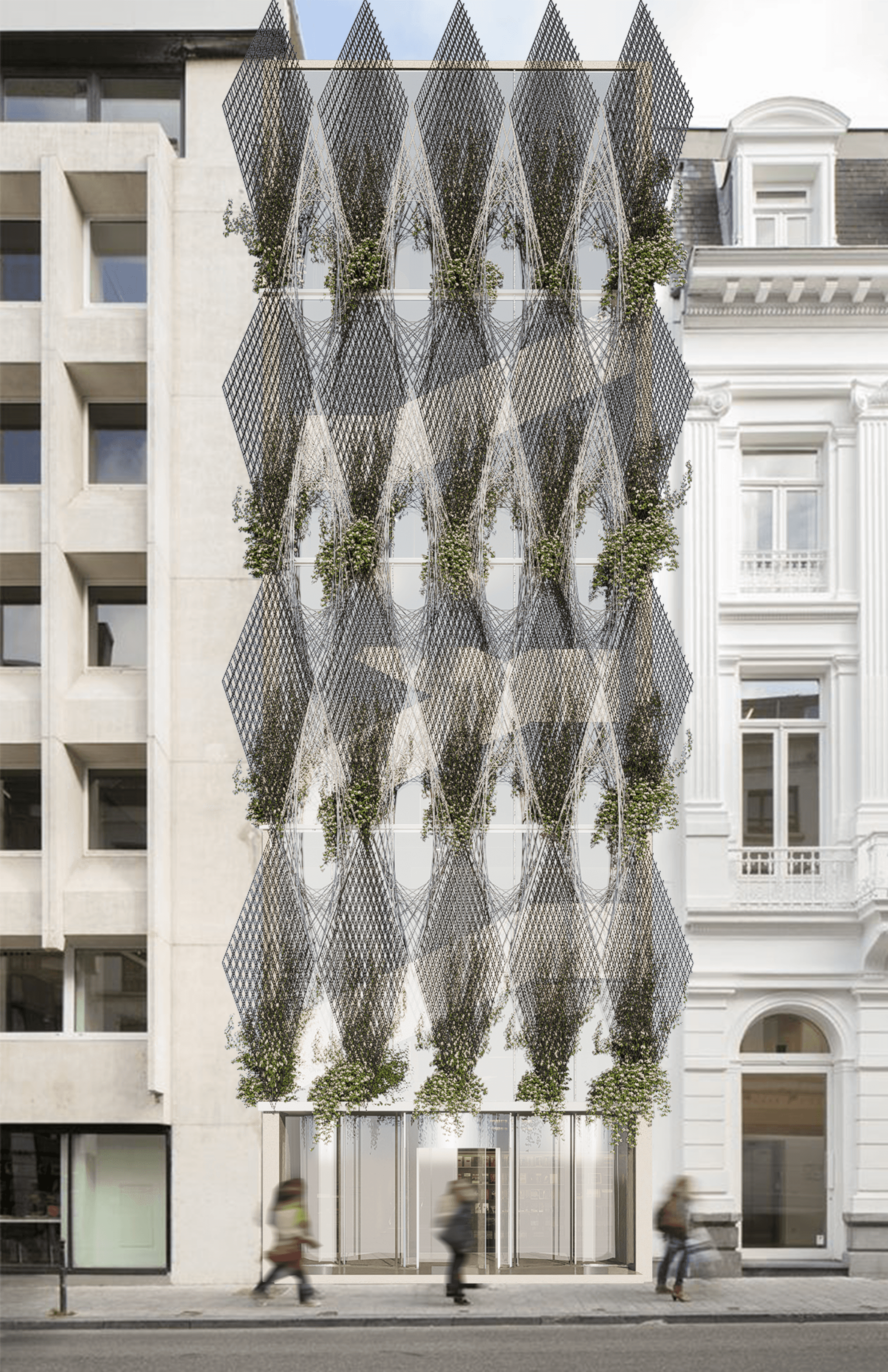 This research project explores the potential of robotic fabrication to produce ultra-lightweight façade systems through carbon fiber weaving. Using the ABB IRB 2600 robotic arm, we developed a process that extrudes and weaves silicone-coated fiber sleeves into diamond-shaped modules. These geometries were designed to achieve both structural efficiency and visual delicacy, allowing the façade to act as a living membrane between architecture and nature. Applied to the entrance of the Bruges Museum, the prototype reimagines the building’s identity with an elegant, porous skin that supports climbing vegetation and enhances natural shading. The result is a performative and ecological façade that balances technology and craft — a system that can be fabricated faster, weighs significantly less than traditional metal structures, and evolves over time as the living layer grows across its surface.